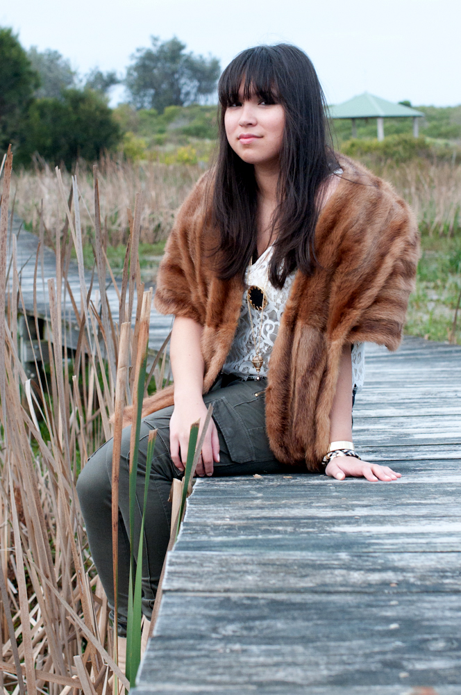 Sportsgirl Wedges and Lace Cami. Cotton On Skinny Cargo Pants. Vintage Fur Shrug.